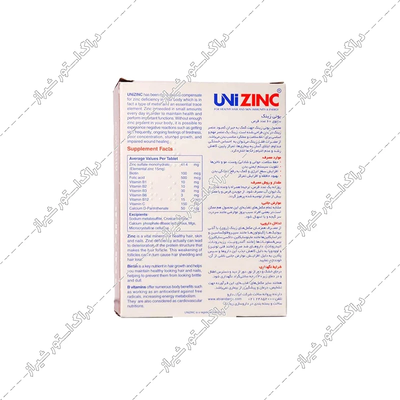 قرص یونی زینک یک مکمل غذایی است که حاوی ترکیبات مفید شامل زینک، ویتامینهای گروه B و ویتامین C است که به سلامت پوست، مو و ناخن کمک میکند. زینک به سلامت پوست و مو و تقویت سیستم ایمنی کمک نموده و در بهبود رشد و رشد قدی مؤثر است. بدن سیستم خاصی برای ذخیره زینک ندارد و به همین دلیل لازم است که برای اجتناب از کمبود زینک، نیاز روزانه به این ماده معدنی از طریق منابع غذایی زینک یا مصرف مکملها تأمین شود. کمبود زینک معمولاً در مبتلایان به بیماریهای گوارشی و آنمی داسیشکل، گیاهخواران، نوزادان بالای 6 ماه، زنان باردار و افراد الکلی بیشتر دیده میشود. یونی زینک 136 درصد نیاز تغذیهای روزانه به این ماده معدنی را تأمین میکند.