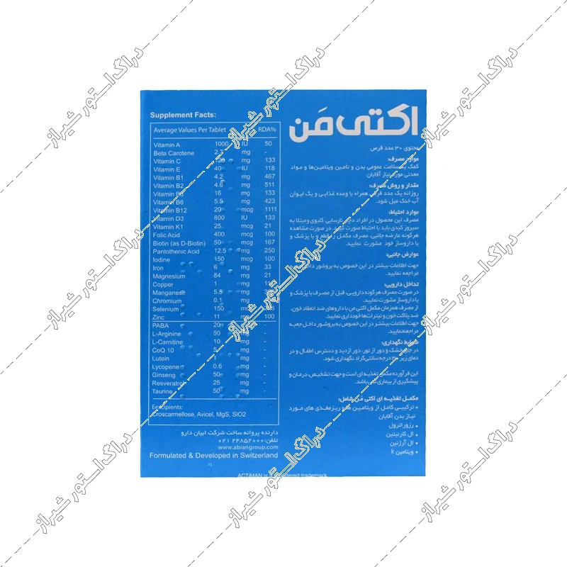 قرص اکتی من ابیان دارو یک مولتی ویتامین کامل حاوی انواع ویتامینها و مواد معدنی است که بهطور ویژه برای آقایان فرموله شده است. علاوه بر مواد مغذی ضروری، قرص اکتی من حاوی مواد مغذی ویژهای مانند لیکوپن، جینسینگ، پابا، کیوتن، آرژنین، کارنیتین، تائورین، رزوراترول و ... نیز میباشد که به ارتقای سلامت عمومی، تقویت توان جسمی و کاهش خستگی کمک میکنند. قرص اکتی من با تامین انرژی فراوان، حجم بافت عضلانی آقایان را حین تمرینات ورزشی بیشتر میکند و برای تقویت قوای جنسی، سلامت عمومی بدن مناسب است.