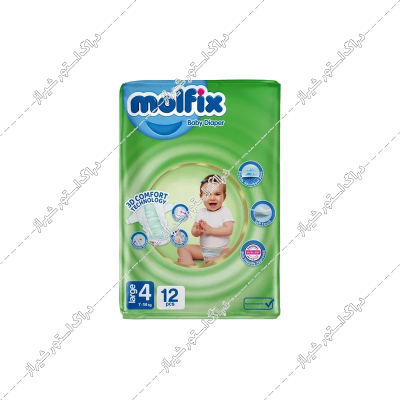 پوشک بچه سایز 2 مولفیکس مناسب برای نوزادان با وزن 3 تا 6 کیلوگرم است. این پوشک دارای لایههای عمودی جهت جلوگیری از نشت ادرار و مدفوع نوزاد بوده و وجود چسبهای محکم و ضد حساسیت در این محصول نحوهی استفاده از آن را آسانتر کرده است. تبادل هوا از طریق پوشک به راحتی امکانپذیر بوده و مانع از ایجاد قرمزی و التهاب بر روی پوست حساس کودک میشود. سطح رویی این پوشک بسیار نرم است و ساختار منعطف آن موجب راحتی بدن کودک میشود.