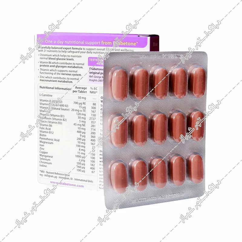 قرص دیابتون ویتابیوتیکس ترکیبی کامل از 21 ریزمغذی شامل 12 نوع ویتامین از جمله ویتامینهای A ،D3 ،C ،B12 ،B6 ،B5 ،B3 ،B2 ،B1 و E، فولیک اسید و بیوتین، 8 مادهی معدنی از جمله کروم، آهن، سلنیوم، روی، منیزیم، مس، ید و منگنز، و همچنین اسید آمینه ال-کارنیتین است و به طور تخصصی به عنوان یک مولتیویتامین برای افراد دیابتی تولید شده است. مقدار به کار رفته کروم در قرص دیابتون ویتابیوتیکس نسبت به برخی محصولات مشابه بالاتر است که در بهبود سطح قند خون مؤثر بوده و در ترکیبات آن از ال-کارنتین نیز استفاده شده است که تأثیر مثبتی بر کاتابولیسم گلوکز در بیماران دیابتی دارد.